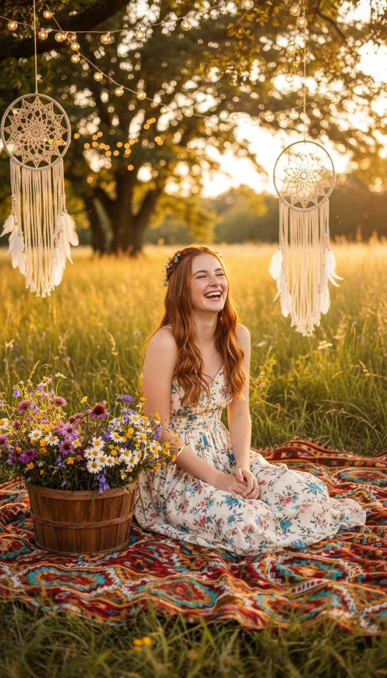 Imagine a whimsical outdoor setting, bathed in soft golden hour light, perfect for a relaxed yet incredibly stylish photoshoot. This theme involves setting up a cozy picnic blanket, plush pillows, dreamcatchers, and an assortment of natural elements like flowers and rustic lanterns. It’s an ideal choice for the free-spirited individual who loves nature and a laid-back aesthetic. The bohemian vibe ensures every shot feels effortless, warm, and deeply personal, capturing your natural beauty and joyful spirit.