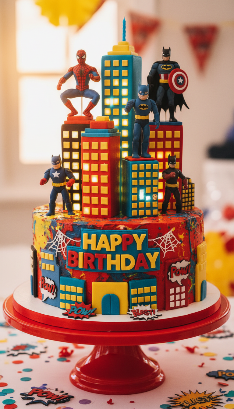 Transform his birthday into an epic superhero saga with a multi-tiered cityscape cake. Each tier can represent a different level of a bustling metropolis, complete with edible skyscrapers and windows. Place his favorite superhero figurines dramatically posed on the rooftops, ready to save the day. This cake isn’t just dessert; it’s a dynamic battleground of flavor and fantasy, sure to make him feel like the ultimate hero of his own party. It’s a fantastic way to celebrate his strength and the incredible adventures that lie ahead.