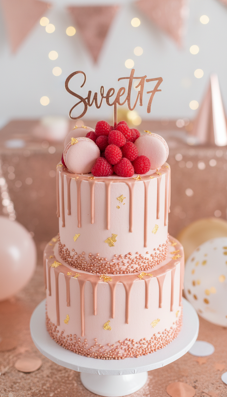 Embrace the classic ‘Sweet 17’ theme with a modern twist. A multi-layered drip cake, adorned with luxurious chocolate or colorful ganache drips cascading down its sides, offers an elegant yet playful aesthetic. Decorate with fresh berries, macarons, sprinkles, or even edible glitter for a truly decadent look. This cake is perfect for celebrating this special age with a touch of sophistication and plenty of deliciousness.