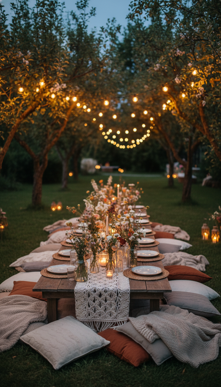 Embrace the free-spirited vibe with a Boho Chic Garden Party, perfect for an outdoor or semi-outdoor celebration. Think macrame hangings, dreamcatchers, wildflower arrangements, and comfortable floor seating with plush cushions and low tables. Incorporate string lights and lanterns for a magical evening glow, and consider a DIY flower crown station for guests. This theme is all about natural textures, earthy tones, and a relaxed, artistic atmosphere, making it effortlessly elegant and highly shareable on Pinterest for its organic beauty.