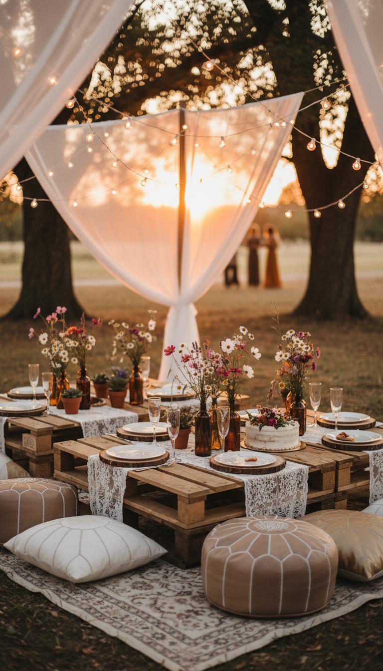 Embrace a relaxed, earthy vibe with a Boho Chic Picnic. Lay out low tables or blankets on the grass, adorned with macrame runners, potted succulents, and an array of comfortable floor cushions. String fairy lights overhead or drape sheer fabrics for an ethereal canopy. This aesthetic is perfect for an intimate gathering, offering a cozy and stylish setting that encourages laid-back conversation and beautiful photo opportunities under the open sky.