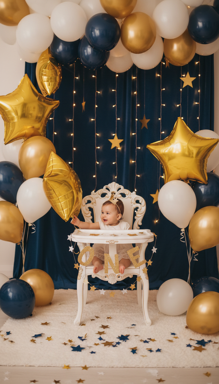 Transform your party space into a celestial dream with a ‘Twinkle Twinkle Little Star’ theme. Decorate with a sophisticated palette of navy blue, gold, and white, incorporating shimmering star-shaped balloons and delicate fairy lights. Drape soft fabrics to create a cloud-like effect and hang sparkling star garlands. This theme evokes a sense of wonder and magic, perfect for celebrating your shining little star’s first year.