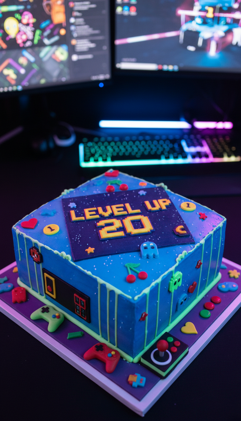 Celebrate hitting a new level in life with a cake designed like a vintage arcade game screen, a console controller, or stacked game cartridges. This theme is perfect for the gamer turning 20, symbolizing their journey and achievements in both virtual and real worlds. Incorporate edible pixels, joystick toppers, or even a ‘GAME OVER’ (just kidding, ‘LEVEL UP!’) message. It’s a playful and nostalgic way to mark this significant milestone, inviting everyone to join in the fun.
