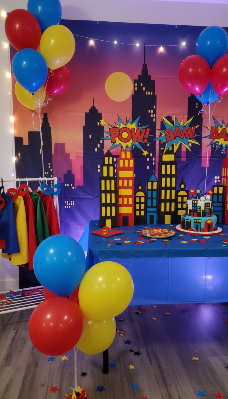 Transform your party area into a bustling metropolis where your little hero can save the day! Utilize city skyline cutouts, comic book speech bubbles, and vibrant primary colors like red, blue, and yellow. Hang capes and masks for guests, and create a ‘photo booth’ with a dramatic backdrop of towering buildings. This theme encourages imaginative play and makes every boy feel like the star of his own action-packed story.
