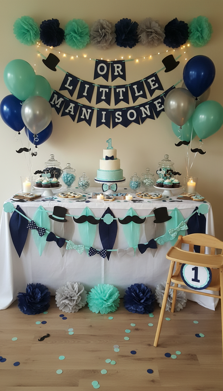 Embrace sophistication with a charming ‘Little Man’ theme. Decorate with bow ties, suspenders, mustaches, and mini top hats. Use a color palette of navy, gray, and mint green to create an elegant yet playful atmosphere. This theme is perfect for adorable photo opportunities and features a delightful smash cake adorned with a tiny bow tie. Guests can even wear their own bow ties to join the fun!