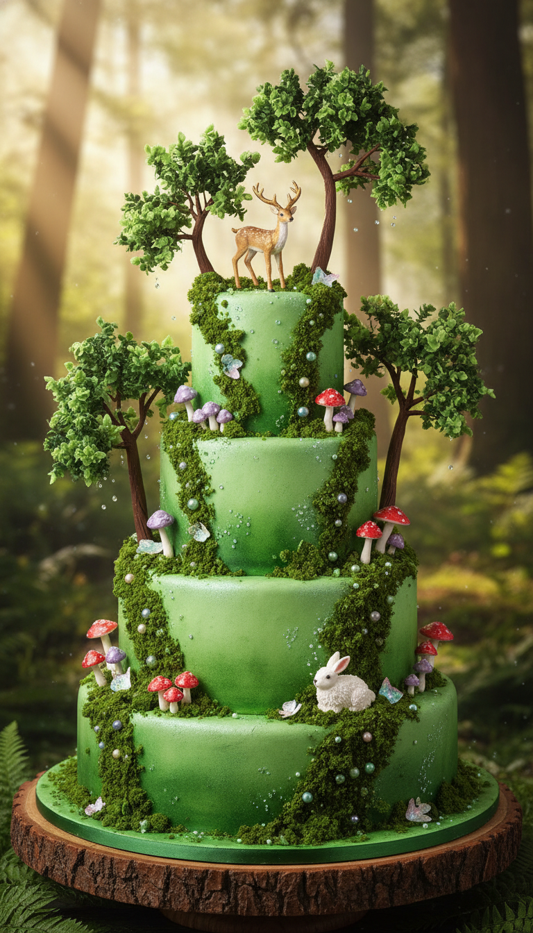Transport your guests to a magical woodland with an Enchanted Forest cake. This design typically features edible trees, moss made from crumbled cake, tiny mushrooms, and perhaps a delicate fawn or fairy figurine. Use earthy tones, edible flowers, and dusting sugars for a dew-kissed effect. It’s perfect for whimsical children’s parties or fairytale-themed celebrations, inviting everyone into a world of fantasy and wonder.