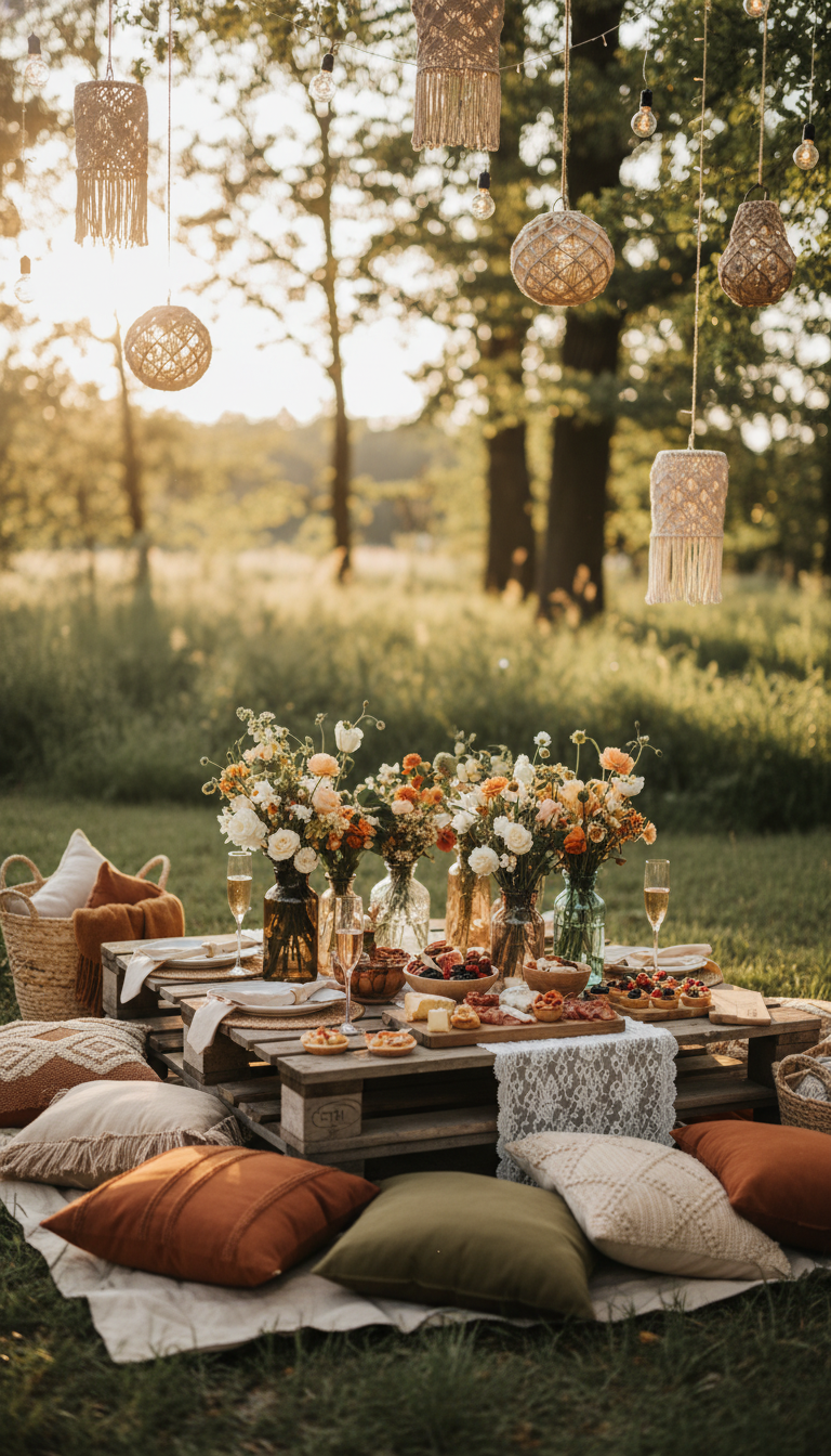 Imagine a low-slung table adorned with an array of mismatched vintage rugs, plush pillows, and an abundance of fresh flowers. Guests can relax on comfortable cushions, enjoying gourmet finger foods and sparkling beverages under a canopy of string lights. This aesthetic is perfect for an intimate gathering in a backyard or park, offering a relaxed yet elegant atmosphere. It’s wonderfully versatile for various age groups and allows for beautiful, candid photo opportunities.