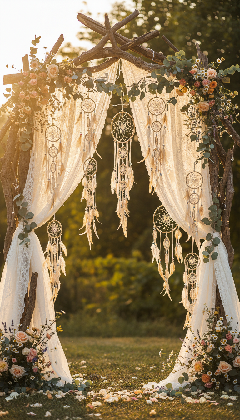Welcome guests into your whimsical world with a stunning dreamcatcher archway. Create this magical entry using sturdy branches or a simple PVC pipe frame, draped with sheer fabrics like lace or chiffon. Embellish it with an array of intricately woven dreamcatchers in various sizes, alongside fairy lights and a cascade of fresh eucalyptus or wildflowers. This inviting focal point immediately sets the tone for a relaxed yet enchanting celebration, inviting everyone to step into a realm of bohemian wonder.